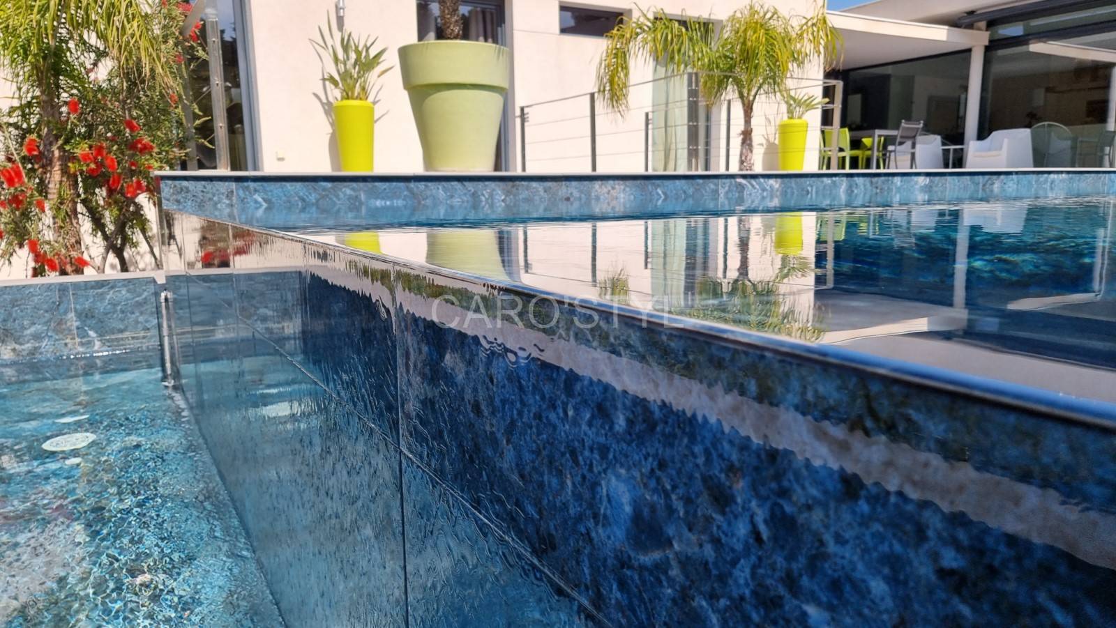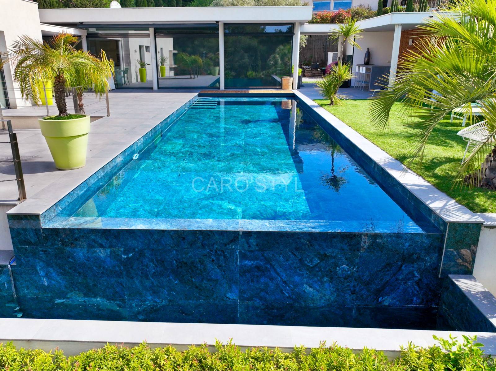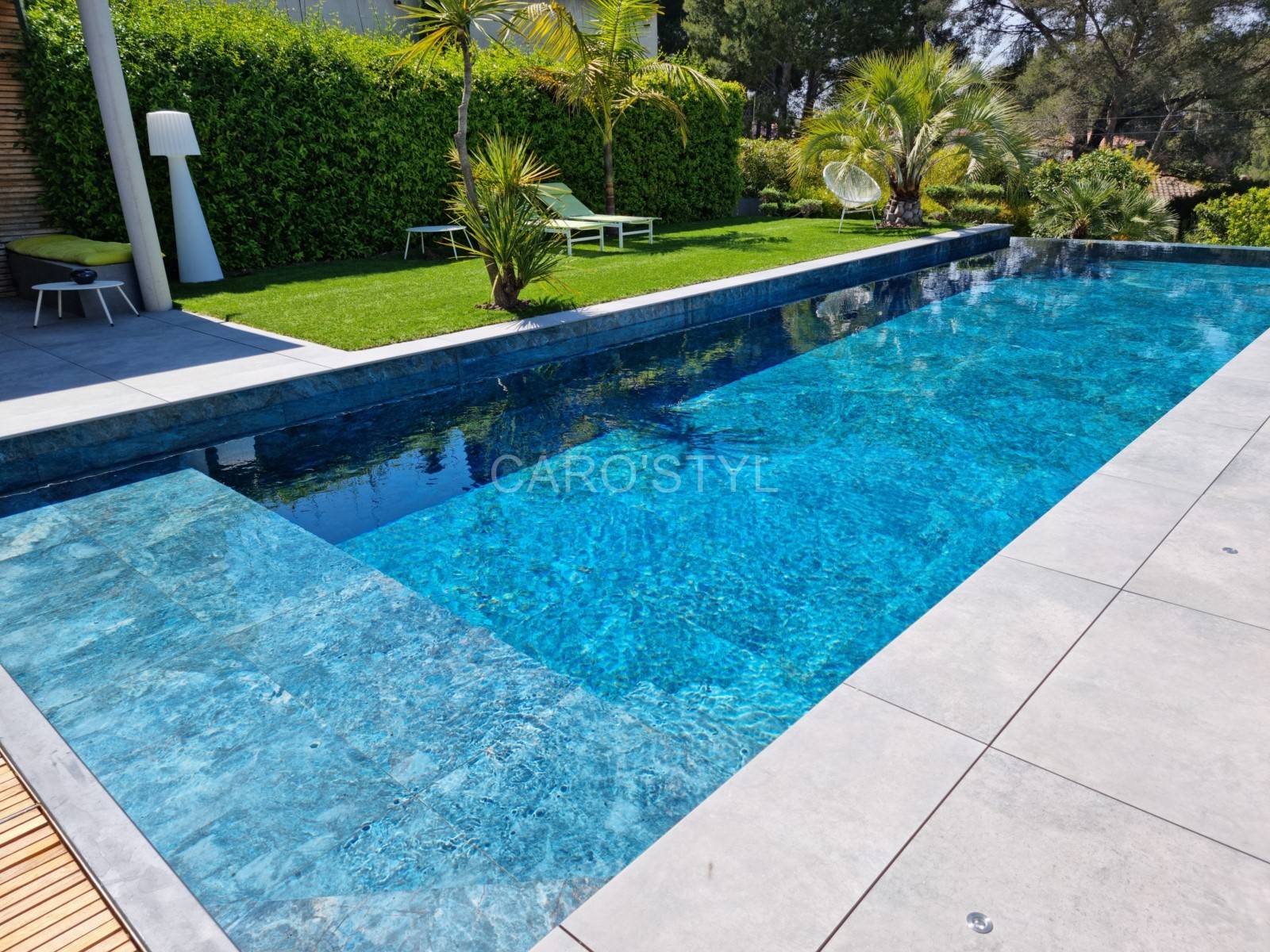 Ce grès cérame marbré bleu donnera à votre piscine un bleu turquoise, digne des îles Porquerolles. Le carrelage de piscine Abysses rendra un bassin unique, seul Caro’Styl vous le propose.