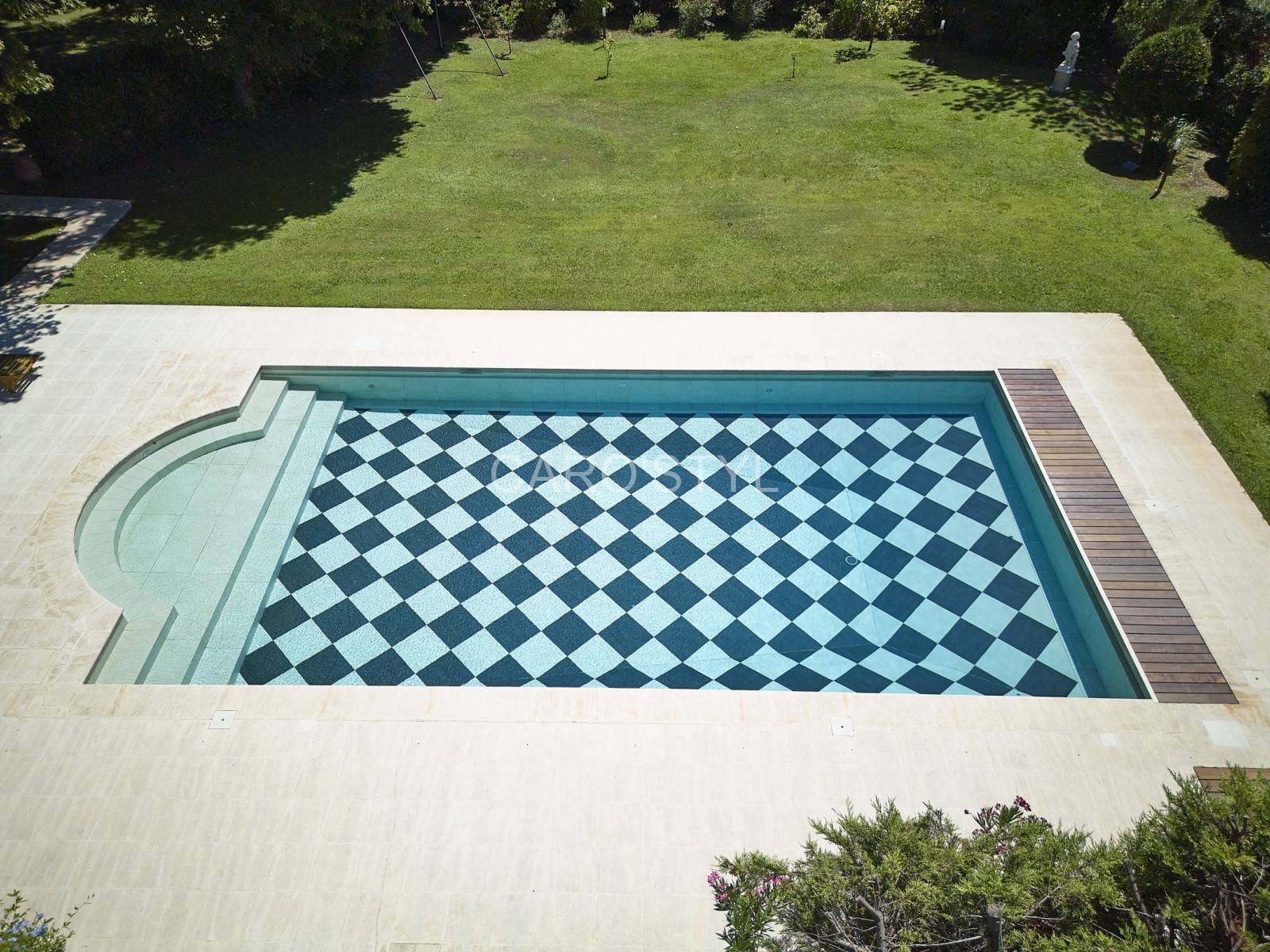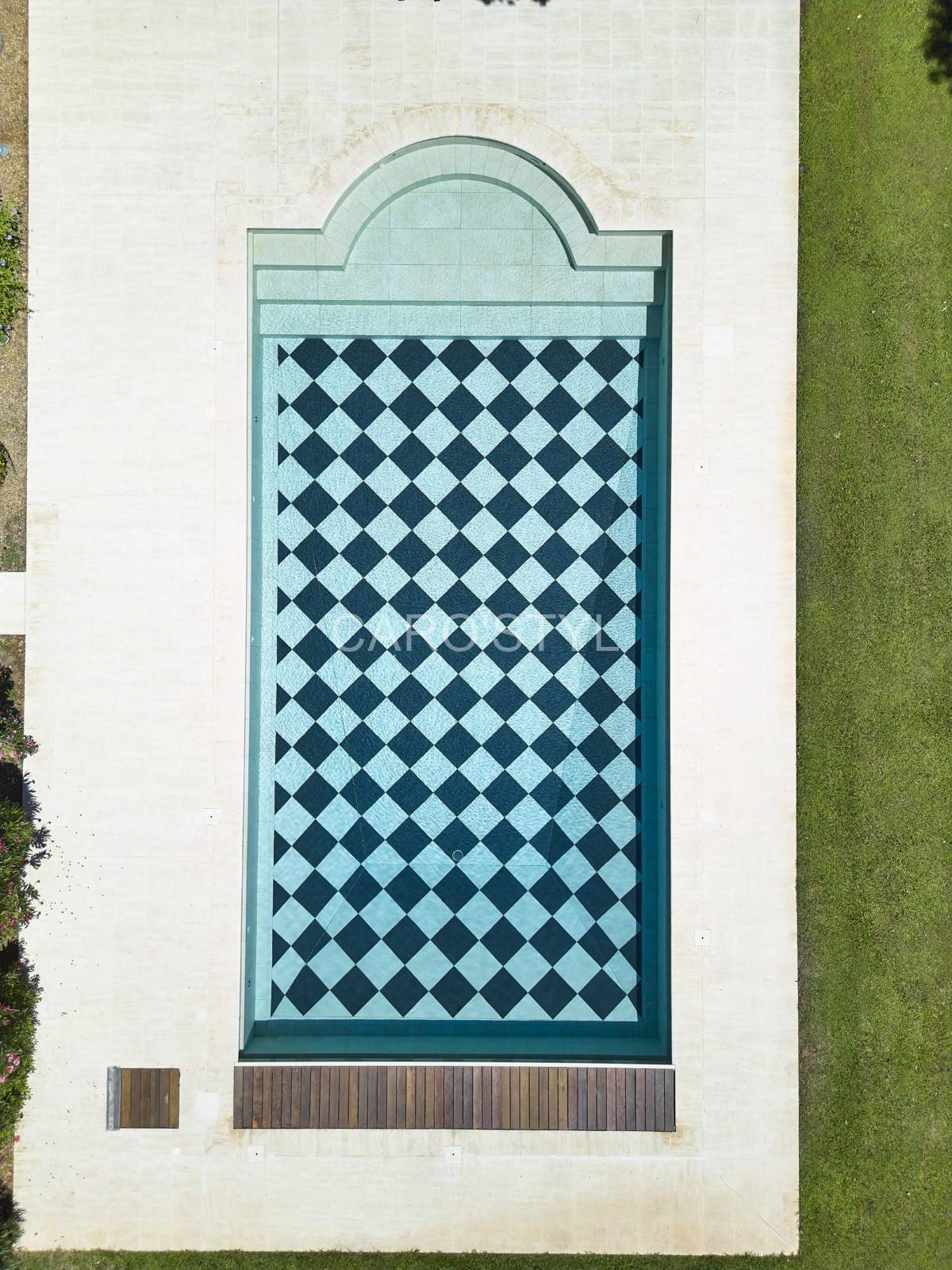 Le résultat ? Un bassin habillé d’un damier en 60x60 cm, alliant un travertin beige doux et un noir effet marbre profond, pour un rendu graphique, noble et intemporel.
