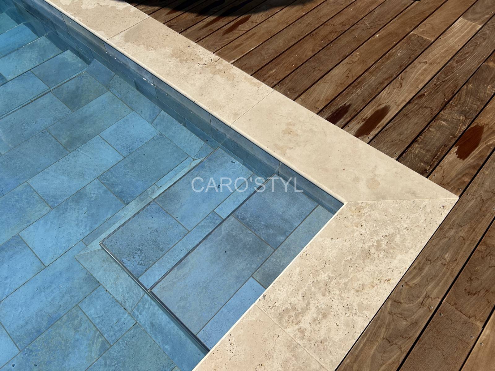 Le format mis en avant dans nos réalisations est le 25,8 x 46,5 cm, particulièrement adapté pour le fond de bassin et les parois immergées. Ce format réduit le nombre de joints, limite l’encrassement, et donne une ligne visuelle fluide à votre bassin.