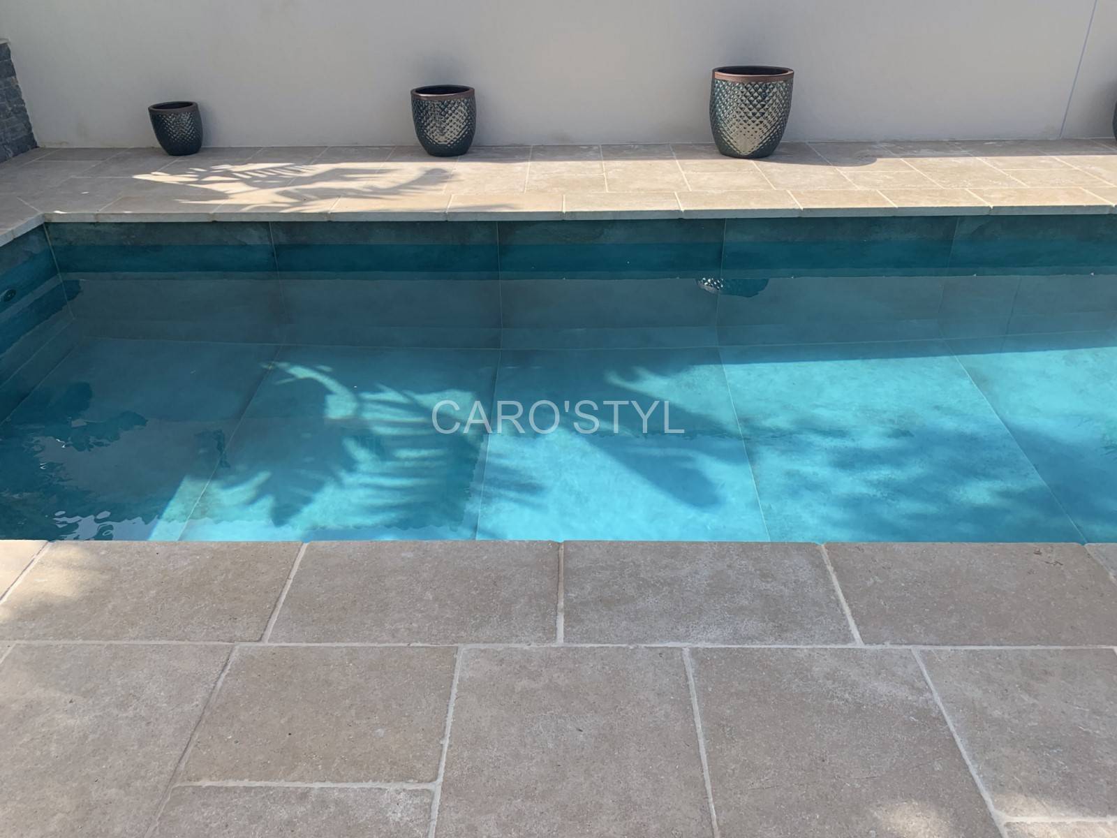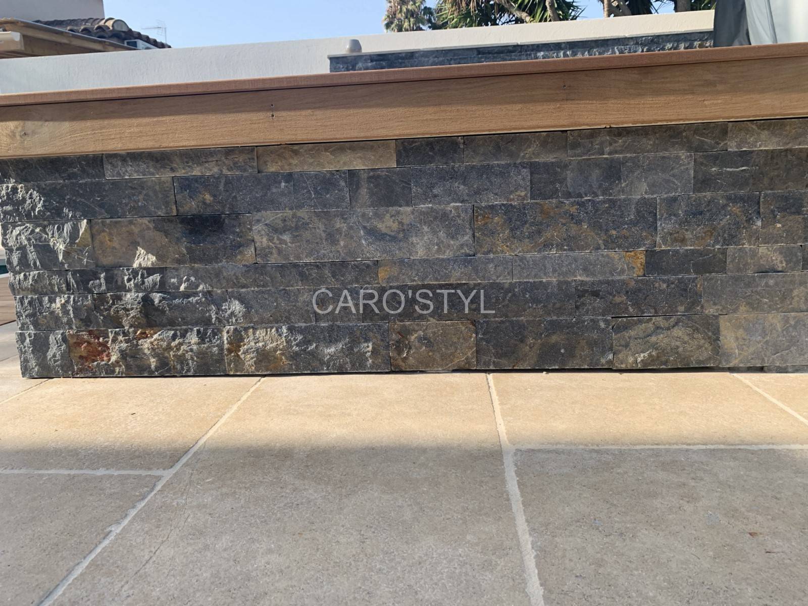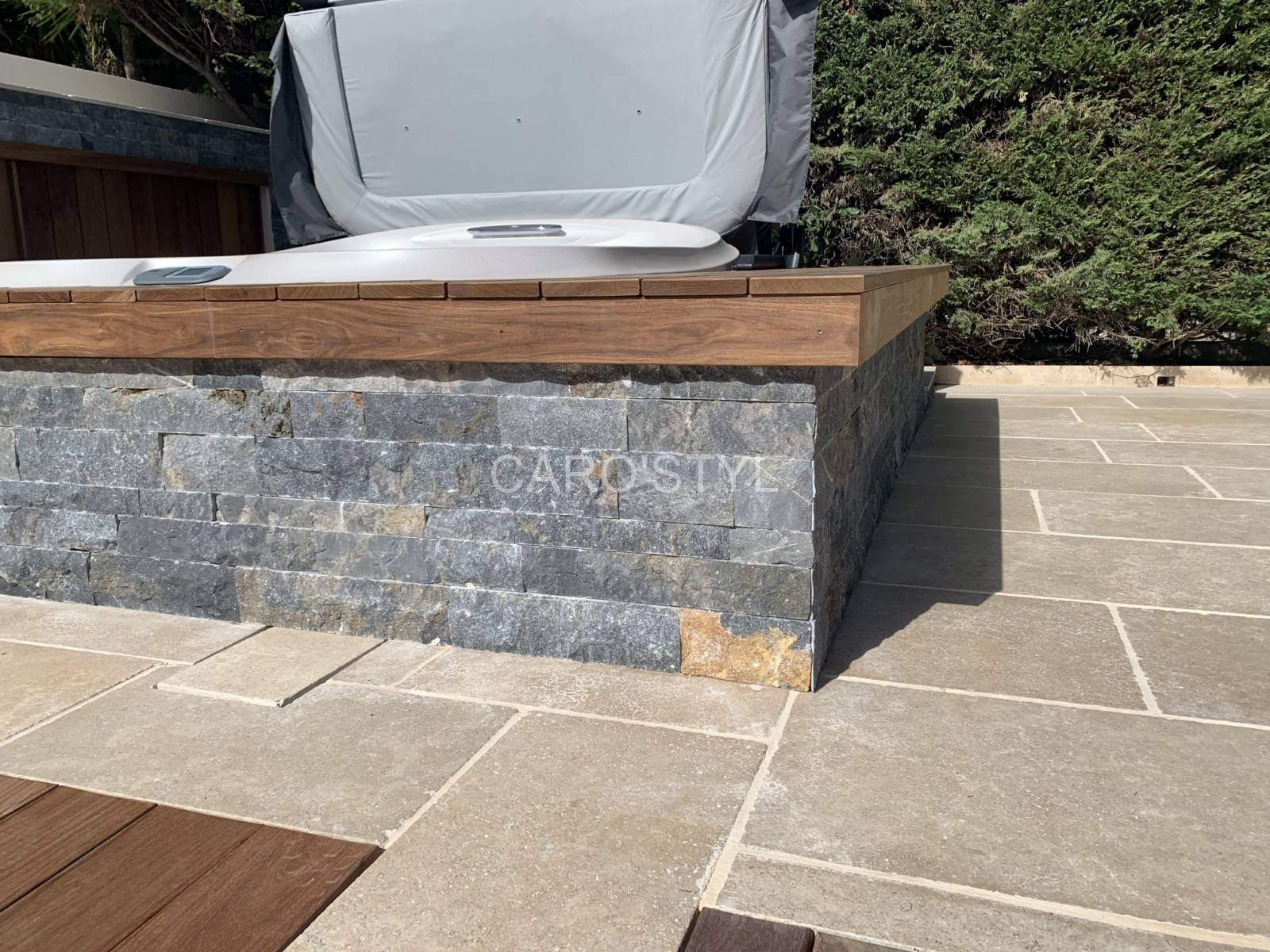 Margelle en 3 et 5 cm d’épaisseur dans une finition vieillie puis flammée (pour son côté antidérapant).
