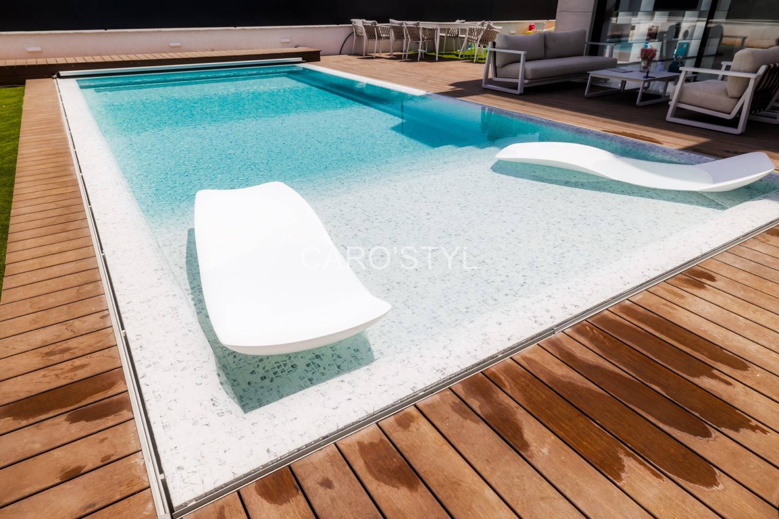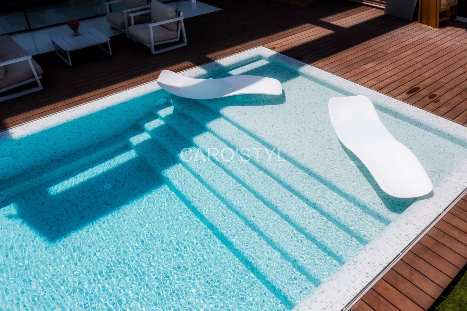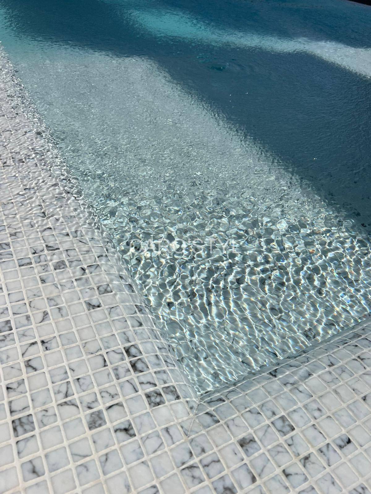 Caro’styl, spécialiste dans la vente de carrelages et mosaïques pour piscine, vous présente sa mosaïque Reviglass Karma Calacatta.