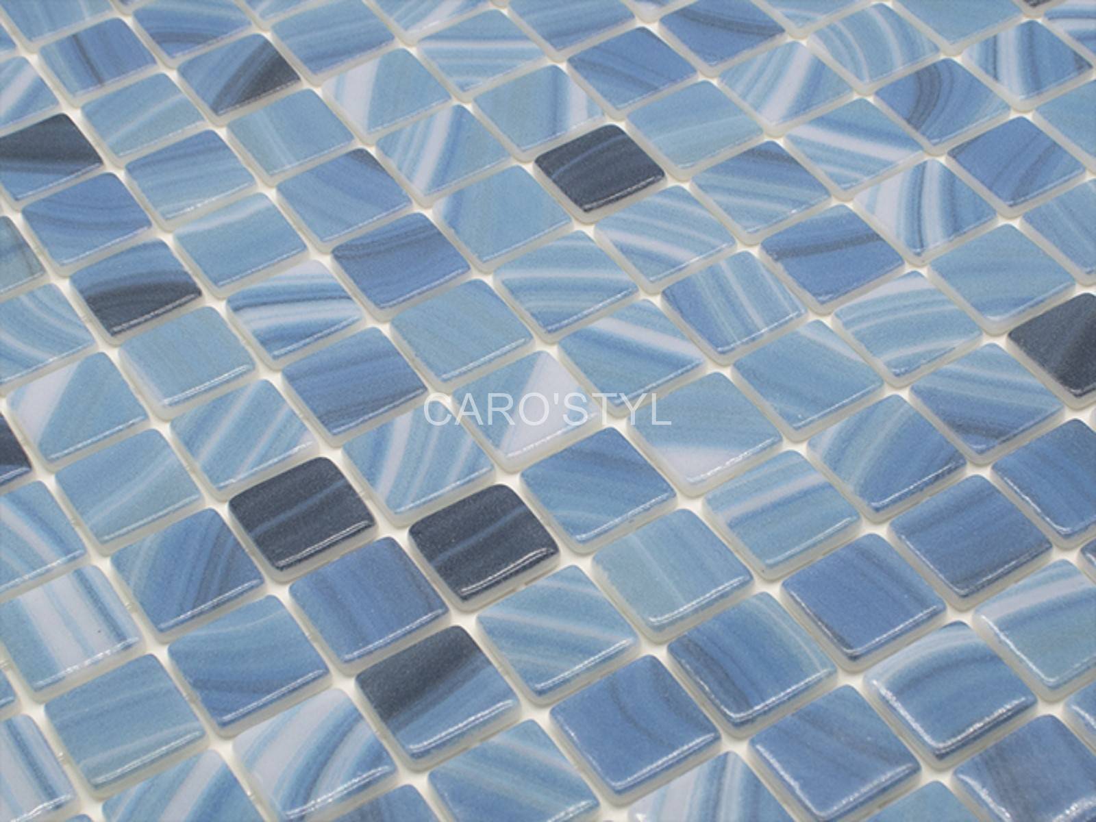 Notre mosaïque de verre Reviglass Karma Ura présente des coloris bleus, blancs, noirs avec un léger veinage sur les émaux de verre. Nous pouvons observer un léger dégradé du blanc au noir en passant par ce bleu clair. Cela donnera une couleur d’eau bleu légèrement foncé pour convenir à tous vos projets.