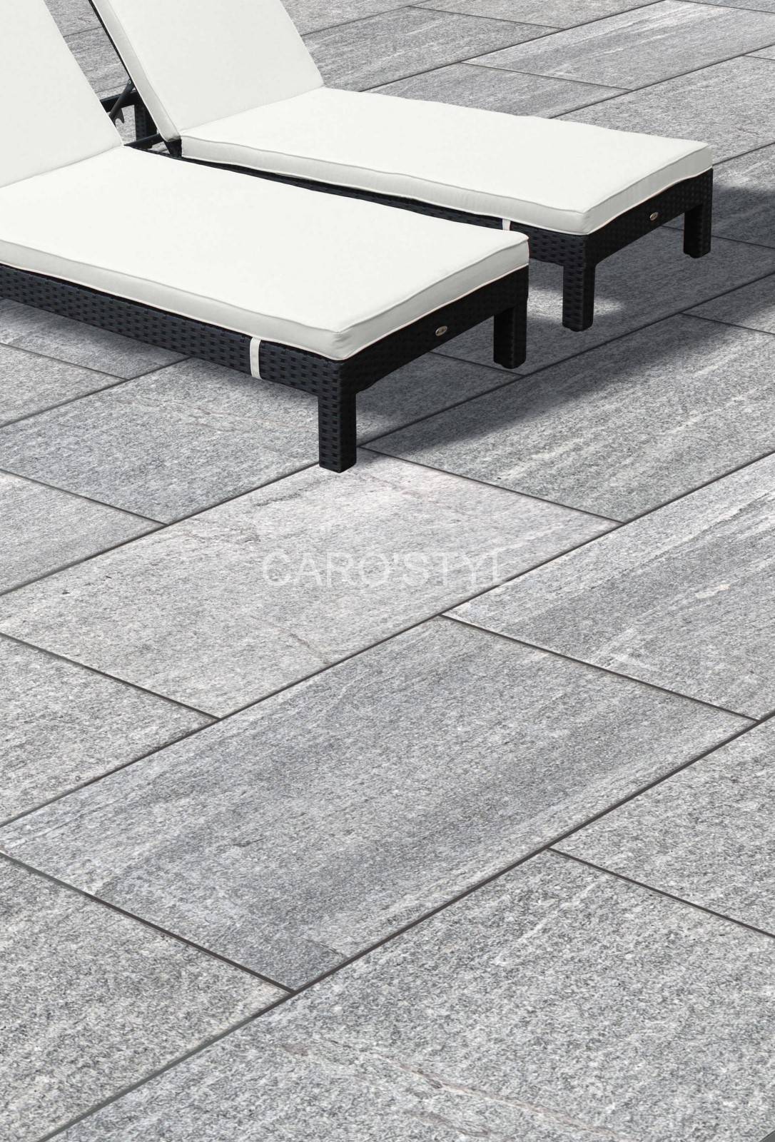 Ici nous vous présentons la Pierre de Glace. Comme son nom l’indique elle restitue une couleur grise mêlant de doux filaments blancs glacés pour sublimer tous vos sols extérieurs en s’adaptant parfaitement à des ambiances contemporaines très prisées de nos jours.