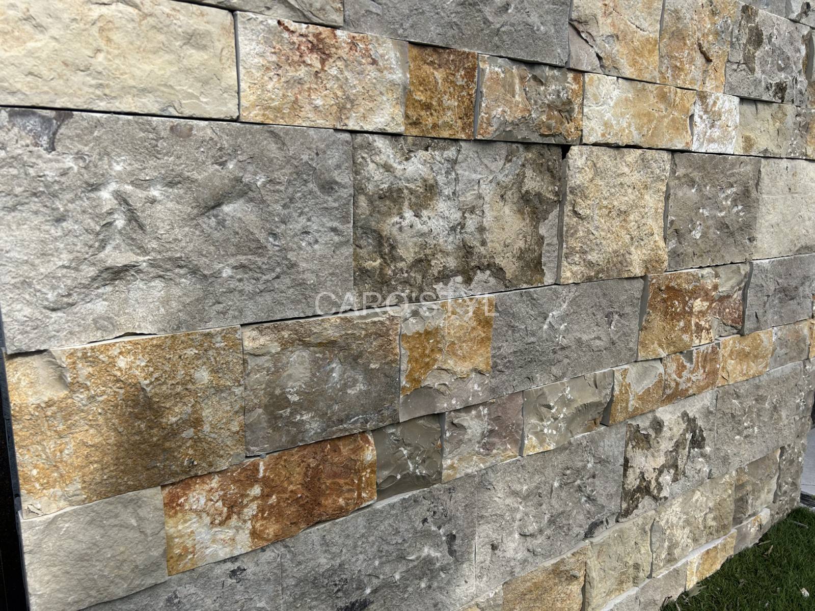 Les angles sortants de cette pierre naturelle, coupés dans la masse, donne l’impression d’un mur en pierres massives.