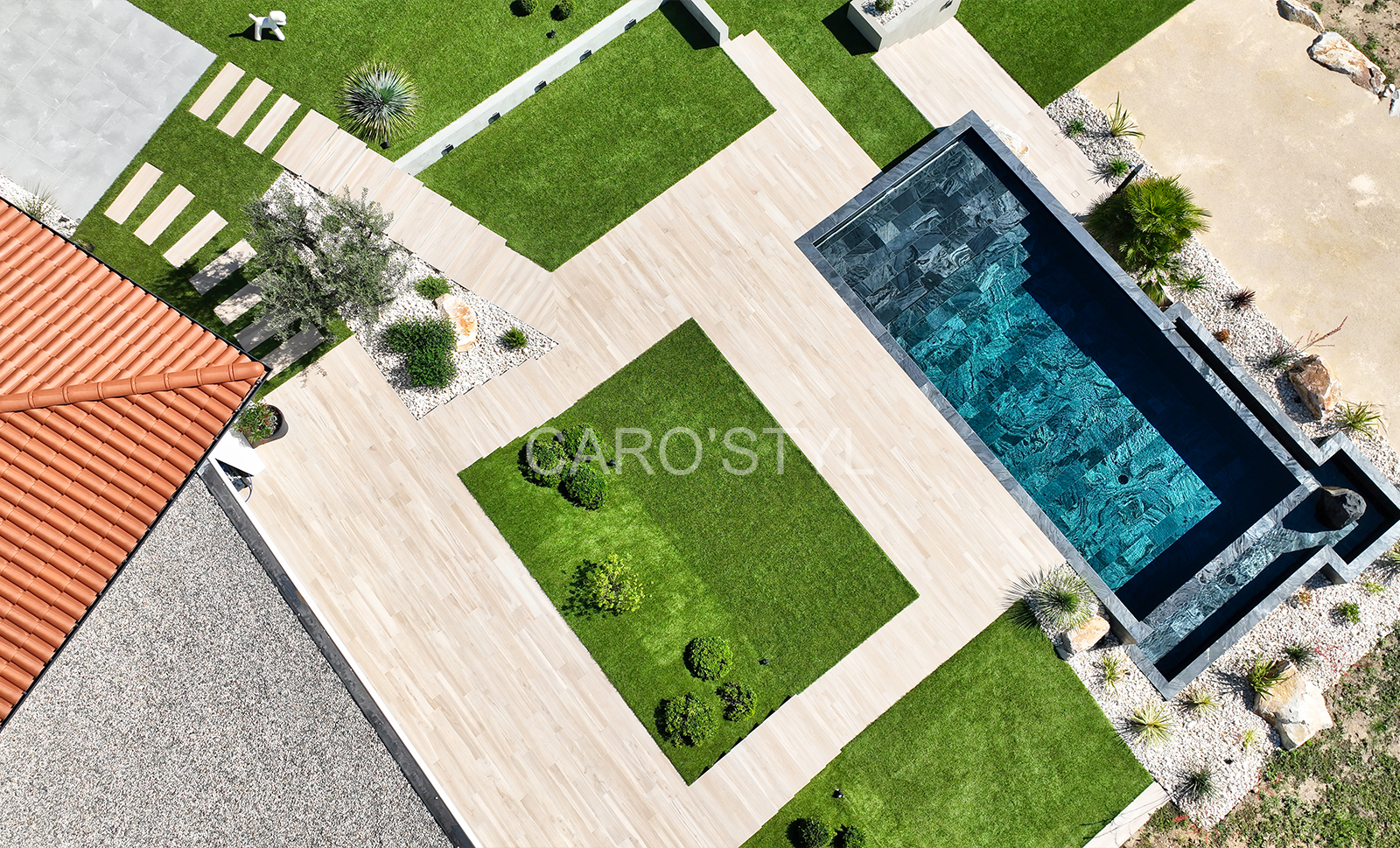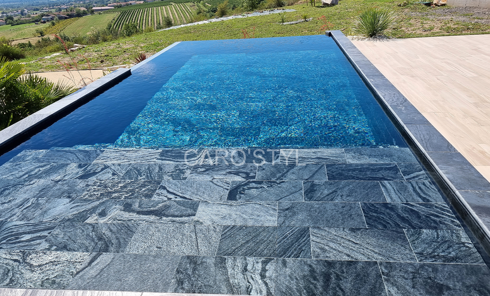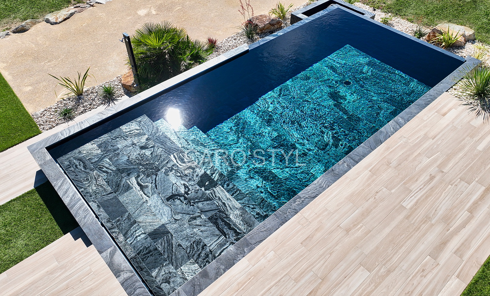 Provenant d’Indonésie, cette pierre naturelle noire aux reflets argentés pour un revêtement de piscine dans le Var offre un toucher d’une infinie douceur. Issue de la famille des schistes, elle dispose d’une certaine anti-glissance pouvant être renforcée avec notre traitement prévu pour les parties peu émergées.
