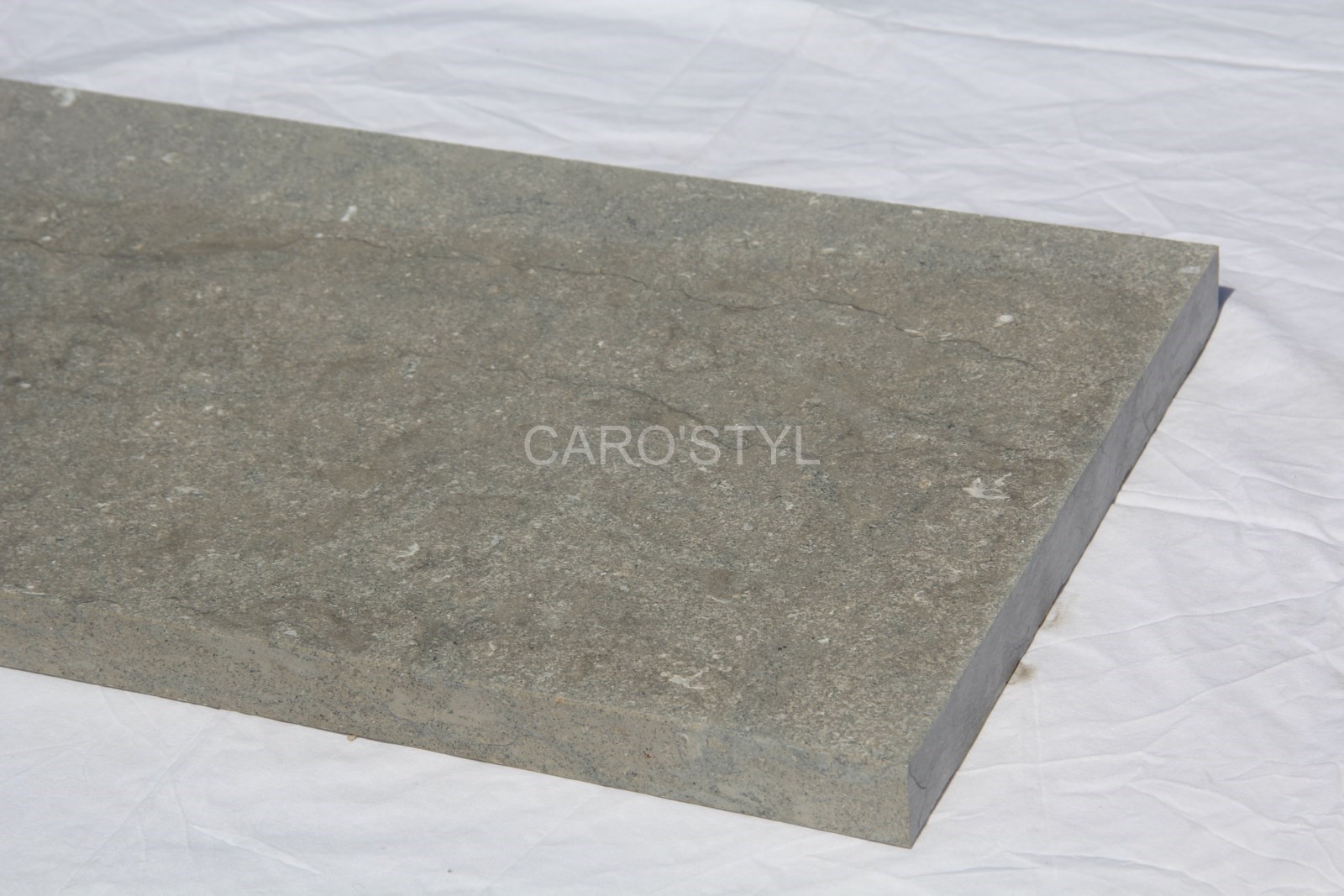 Nous vous proposons cette pierre dans divers formats et épaisseurs dont les: 33X60X3 cm et 33X60X5 cm épaisseur pour les margelles et du 60X60X5 pour le dallage assorti sur plots. La fabrication sur mesure pour des marches d'escaliers, des parements pour vos murs est possible...